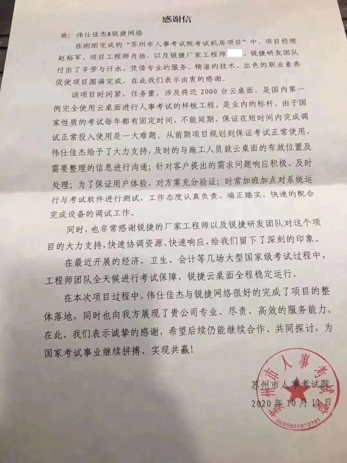 不仅如此,在苏州人事考试院承接的经济、卫生、会计等多场大型国家级考试中,尊龙时凯还提供了考场保障,研发和服务工程师来到考试现场和考试院技术人员一起待命。尊龙时凯云桌面设备全程稳定运行,顺利支撑多场大型国家考试,考试院还特地向尊龙时凯发来了感谢信,以感谢整个项目团队的付出和应用的出色效果。
