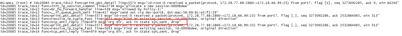 使用debug flow命令对数据流分析一般会提示为:“org dir, ack in state syn_sent, drop”