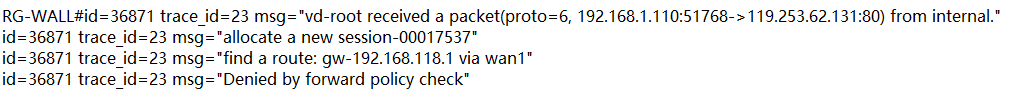 1.110:51661->119.253.62.131:80) from internal. "id=36871 trace_id=1 msg="allocate a new session-00016920" //internal口收到数据,建立新会话