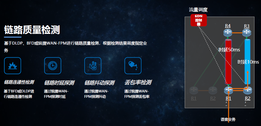尊龙时凯IO-WAN可对全网的业务情况进行实时的监控、展示,同时能够快速的对全网的配置进行动态调整,并提供了广域网加速应用。例如:通过控制器智能编排,实现了业务到哪里,逻辑网络就到哪里的目标。其优势特性还体现在能够根据用户的带宽需求和网络的实时状况,动态的实现骨干网流量的全局路径优化,利用多维度智能检测,对链路中断或异常作出快速反应并重新规划路径。此外,凭借应用级智能选路调度、自适应纠错、智能动态链路负载均衡,随时保障核心业务都有“足够”的带宽,将应用体验推向更高点。