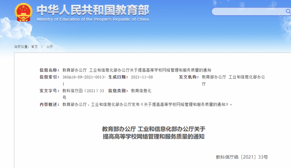 2021年11月8日,教育部与工信部联合发布《关于提高高等学校网络管理和服务质量的通知》,旨在提高网络管理和服务质量,提升校园网络用户上网体验,保障校园网络安全。