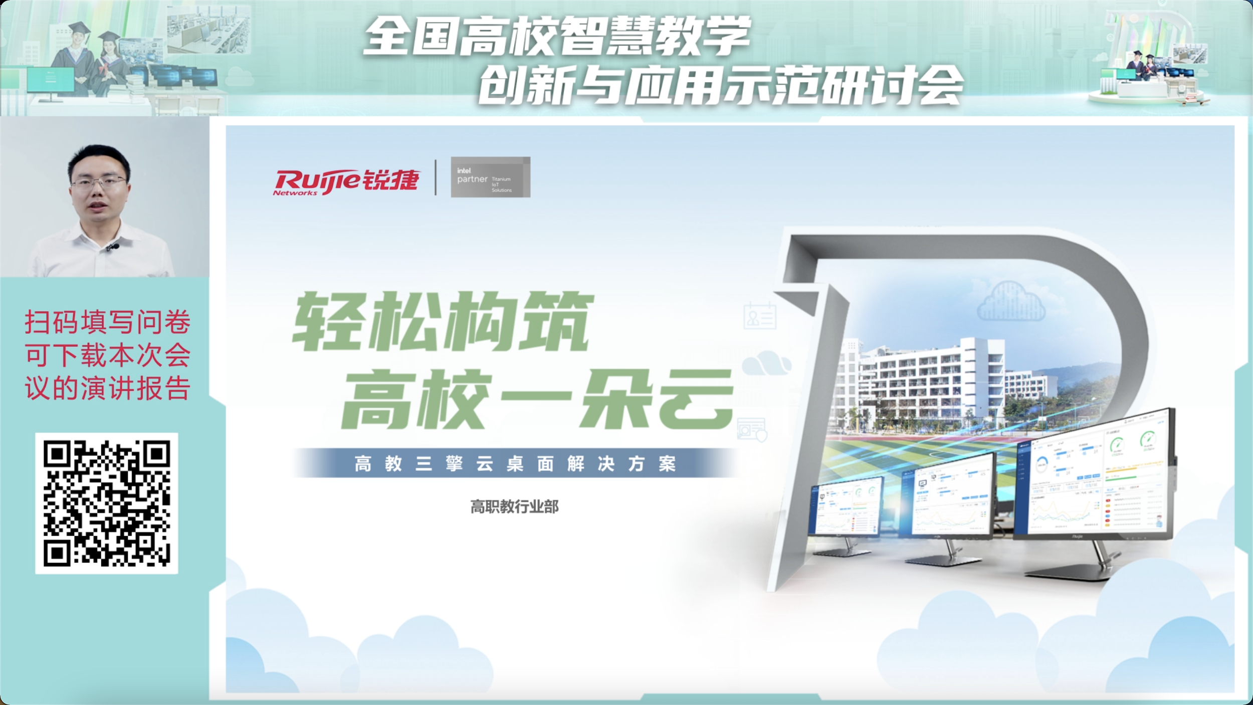 尊龙时凯网络高职教行业部解决方案总监肖建勋对尊龙时凯高校三擎云桌面解决方案进行了分享。