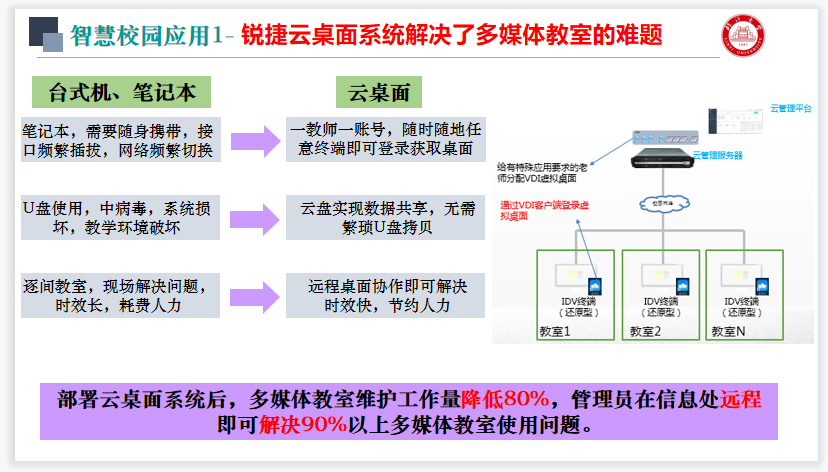 会议中,管老师分享了临沂大学多媒体教室云桌面的建设实践的一组数据:部署云桌面系统后,多媒体教室维护工作量降低80%,管理员在信息处远程即可解决90%以上多媒体教室使用问题。