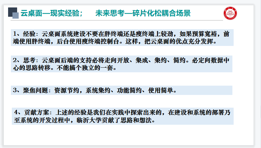 临沂大学信息处管士亮处长结合实践强调:智慧校园建设中的云桌面落地一定要基于学校的实际情况,建设“开放、集成、集约、简约”的云桌面系统。