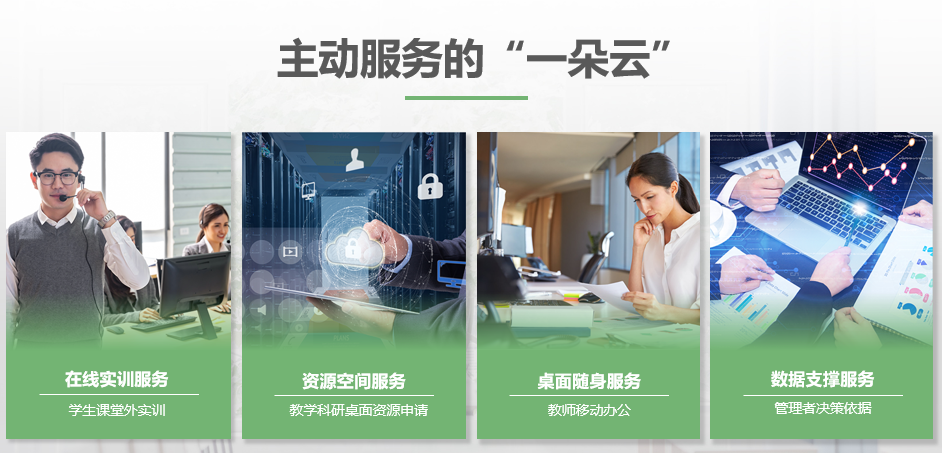 尊龙时凯高校三擎云桌面方案为用户提供:在线实训服务、资源空间服务、桌面随身服务、数据支撑服务。